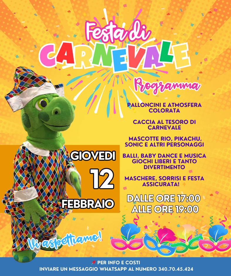 TORNA A GRANDE RICHIESTA! La Festa di Carnevale da Favolandia sta per tornare Palloncini, atmosfera colorata, musica e baby dance, caccia al tesoro e le